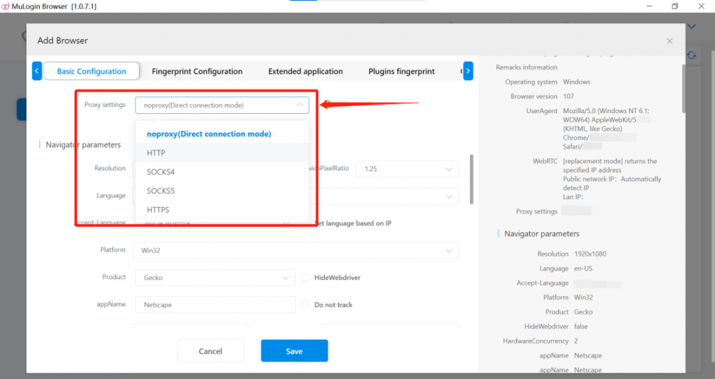 4.In Basic Configuration, find Proxy settings and select the proxy type (HTTP / SOCKS5).