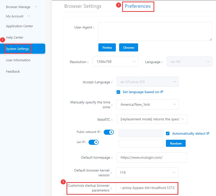 MuLogin Client -> System Settings -> Preferences -> Customize startup browser parameters -> Fill in the "Parameters" -> Save Settings.