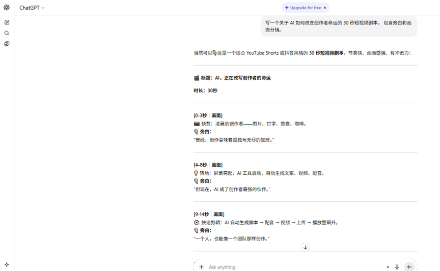 用 ChatGPT 或 Claude AI 输入视频主题,快速生成脚本和镜头说明。