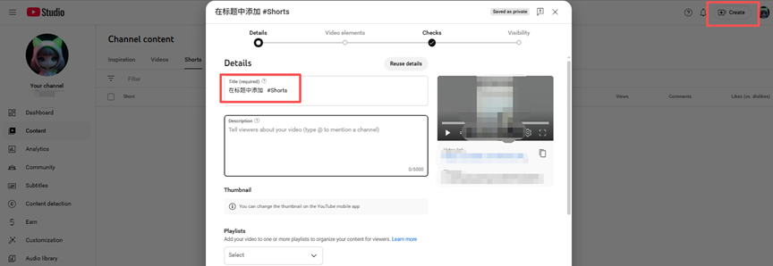 - 添加标题(#Shorts)、标签、话题 → 发布
