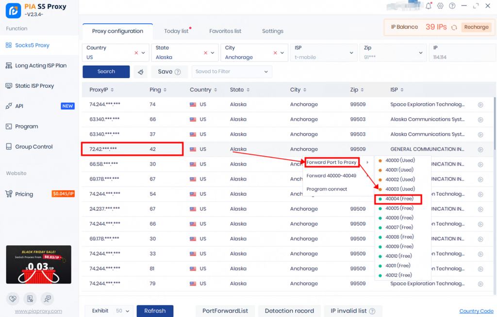 4. 选中任意一个IP,鼠标右键点击IP,选择将端口转发至代理-选中端口【以40004为例】。