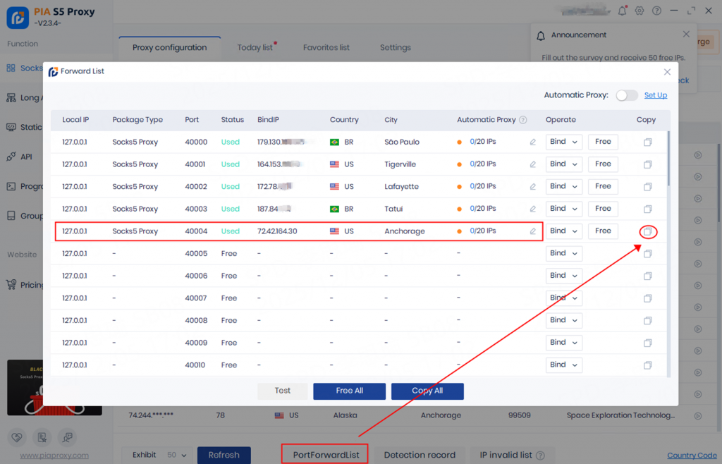 5. 点击端口转发列表,查看所提取IP信息,点击复制。