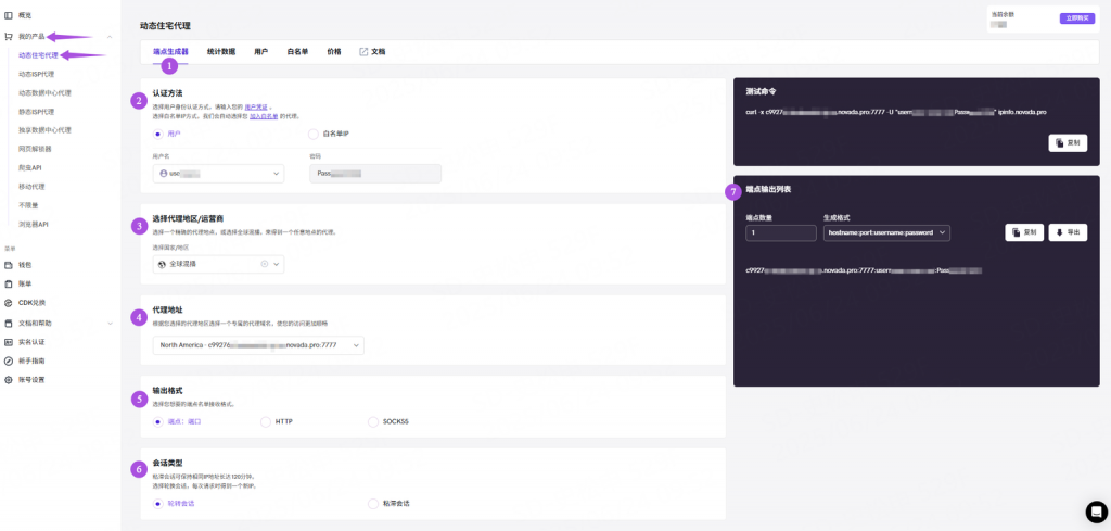 2. 进入 端点生成器 ,在左侧选择已创建的代理用户或白名单IP验证,根据需要选择代理地区等参数后,在右侧 端点输出列表 中获取代理信息(生成格式为hostname:port:username:password),此处以动态住宅代理为示例,其他代理套餐可能不支持 白名单IP。
