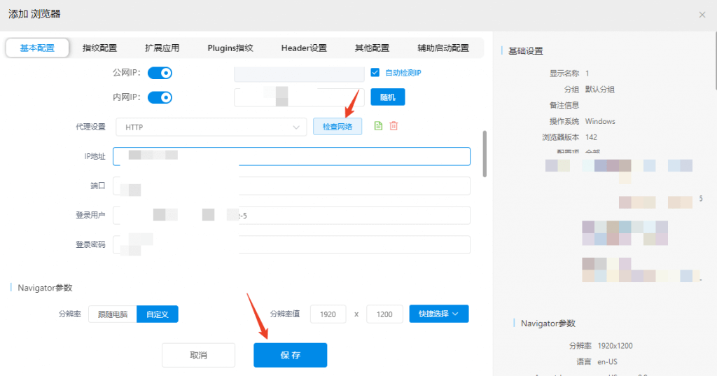 5. 配置代理:找到【代理设置】,【代理类型】选择“HTTP、HTTPS或Socks5”,然后把1024proxy的代理信息填写至相应字段,并点击【代理检测】,检测代理的连通性,确认无误后,点击【保存】即可完成浏览器窗口创建。