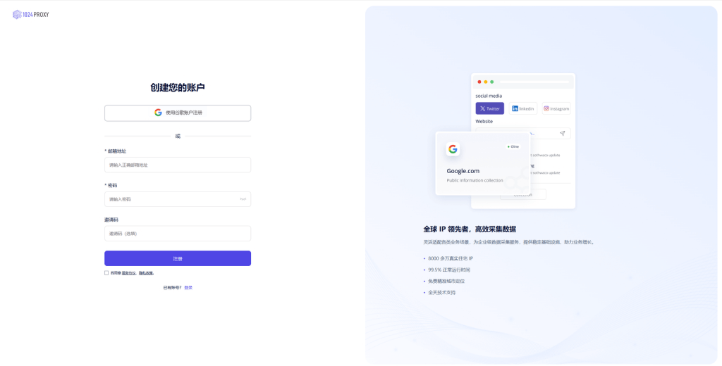 1. 进入1024proxy官网,注册账号后登录后台(除具体子账户功能外还支持免费试用)。