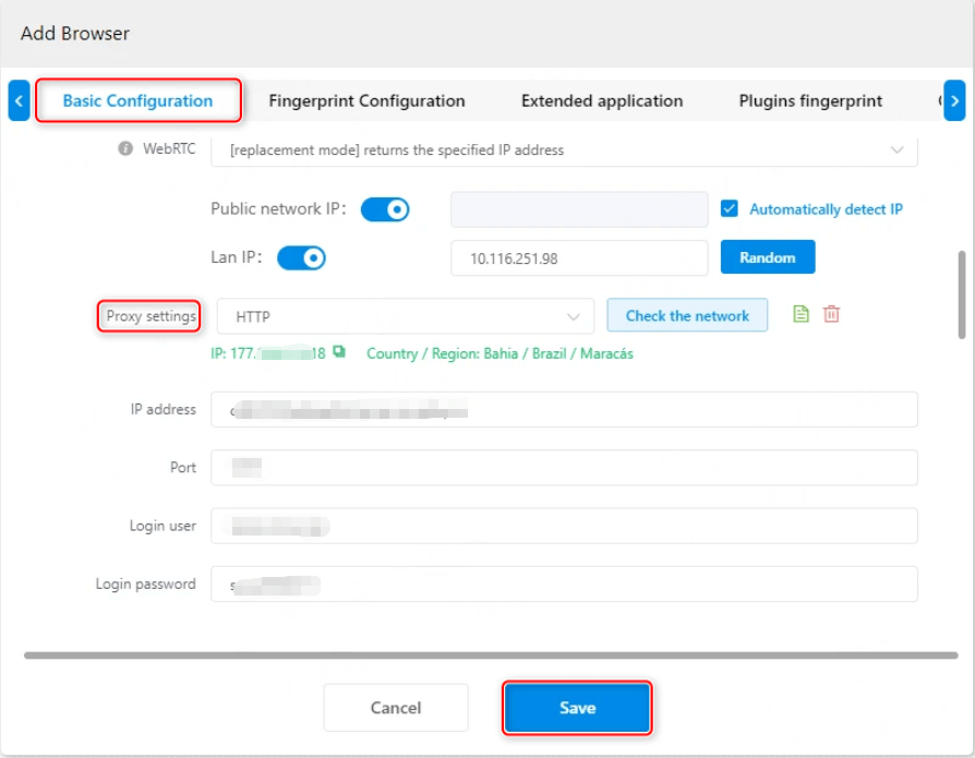 Paste the proxy information obtained from Ping Proxies (hostname: port:username:password). Click Check the network—if IP information appears, the proxy IP connection is successful. Finally, click Save.