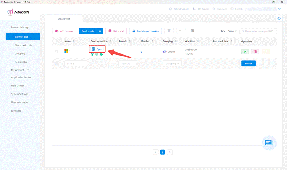 Step 8. The newly created profile will be shown on the "Browser List" tab. Click the "Open" icon to open the browser profile, and you can now browse any website or content online without revealing your own identity.