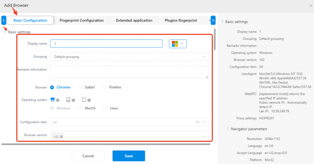 4. New Browser: [Add Browser], a detailed information page as shown in the figure, will appear. Fill in the information in the [Basic Settings] section.