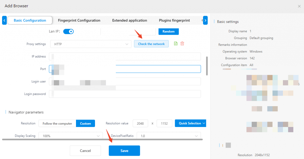 5. Configure proxy: Locate the [Proxy Settings], select "HTTP, HTTPS or Socks5" for the [Proxy Type], then fill in the proxy information of 1024proxy in the corresponding fields, and click [Check the network] to test the connectivity of the proxy. After confirming there are no errors, click [Save] to complete the creation of the browser window.