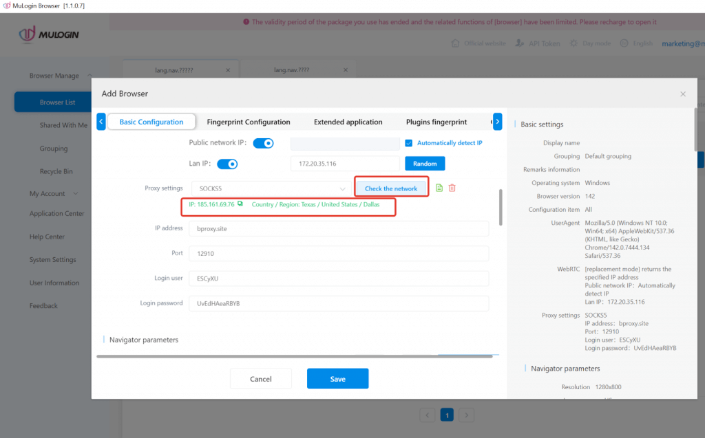 6. Click "Test Proxy". If the connection is successful, MuLogin will display the proxy IP information including the country and IP address. Click "Save" to apply the settings.